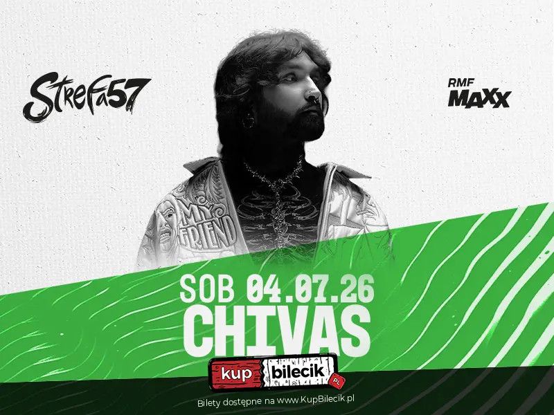CHIVAS ZAGRA 4 LIPCA 2026 NA STREFIE 57! Koncert Chivasa 4 lipca 2026 na Strefie 57 będzie doświadczeniem, które trudno porównać z czymkolwiek innym! Na scenie zamienia się w żywioł - jego energia połączona z emocjami sprawia, że show nabiera mocy z każdym kolejnym numerem! To moment, w którym muzyka nie tylko wybrzmiewa, ale uderza - w serce, w pamięć i w atmosferę całego wydarzenia! Chivas to jeden z najciekawszych twórców dzisiejszej sceny - artysta, który z łatwością łączy różne style i tworzy brzmienia rozpoznawalne od pierwszej sekundy. Ma na koncie współprace z czołówką polskiego rapu: Quebonafide, White 2115, Bedoes 2115! Chivas nie jest jedynym artystą, który zagra na tym festivalu! Piszcie kogo chcielibyście zobaczyć razem z nim na scenie tego dnia! Czekamy na Wasze propozycje!